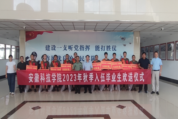 9月14日下午,我校2023年秋季应征入伍毕业生欢送仪式在蚌埠国防教育基地举行。校党委委员、副院长黄远友和蚌山区人民武装部部长曾鸣出席仪式并为应征入伍毕业生颁发入伍奖励金和赠送纪念品。学生处、人民武装部相关负责同志参加活动。仪式由党委学工部部长、学生处处长黄立义主持。