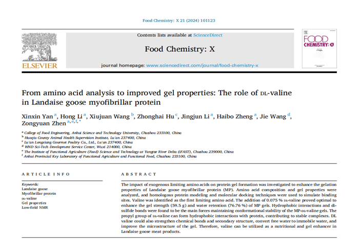 近期,我校食品工程学院动物源食品精深加工与营养团队在中国科学院农林科学领域一区TOP期刊Food Chemistry: X(IF=6.10)在线发表题为“From amino acid analysis to improved gel properties: The role of DL-valine in Landaise goose myofibrillar protein”的研究论文。食品工程学院2021级食品加工与安全领域硕士研究生燕鑫鑫为第一作者,甄宗圆副教授为通讯作者,拼搏平台_拼搏网页版为第一完成单位。