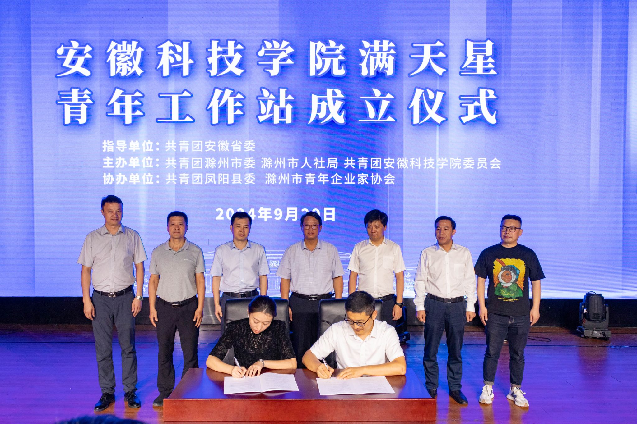 会上,李升和、李国金共同为“满天星”青年工作站揭牌,团滁州市委副书记戴莺、校团委副书记李刚共同签订校地共建“满天星”青年工作站协议。