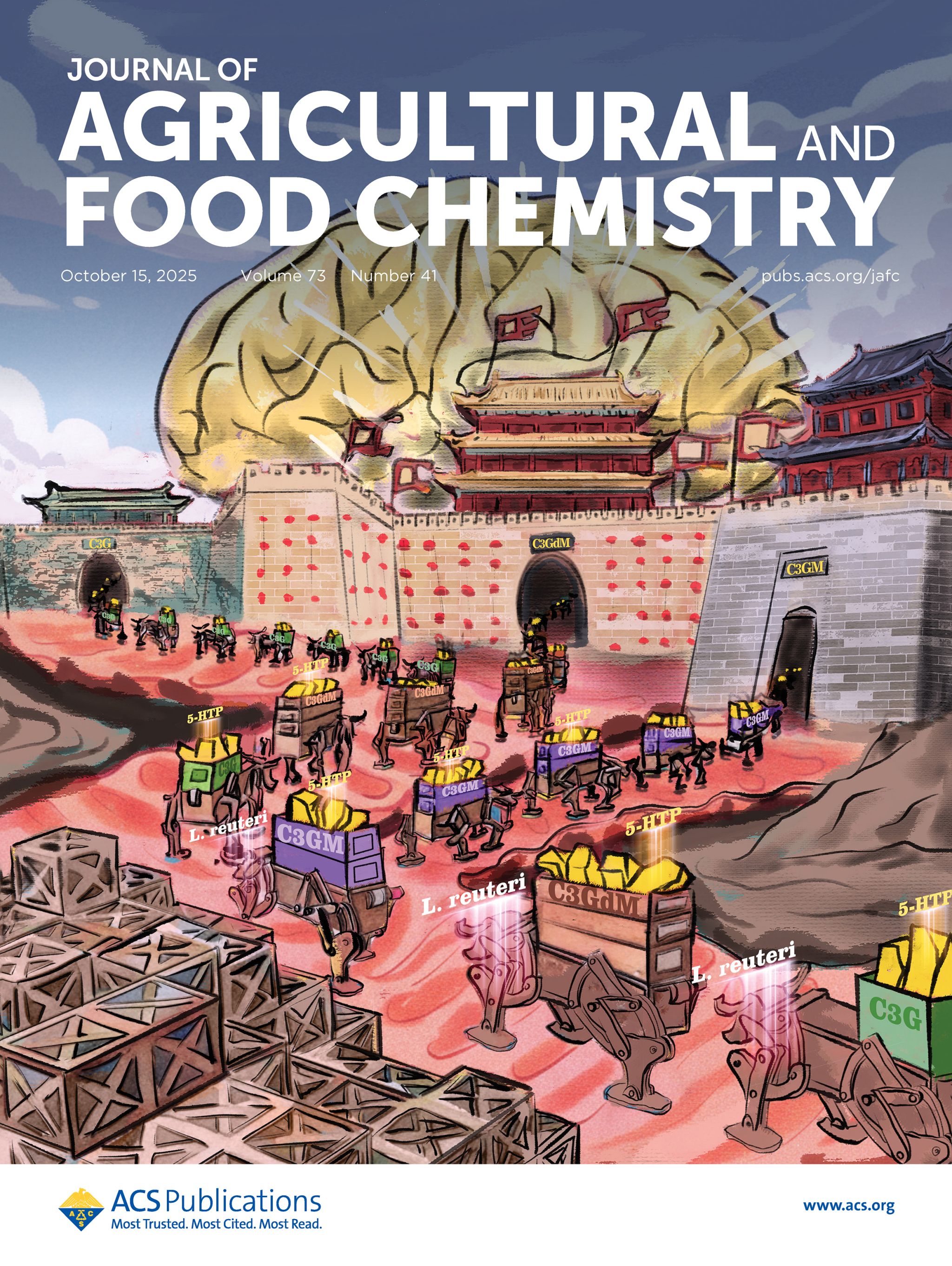 近日,我校食品科学与工程学院分子加工与精准营养实验室陈春旭副教授团队在美国化学学会期刊《Journal of Agricultural and Food Chemistry》(中科院一区TOP,IF 6.2)最新一期(2025,Volume 73, Issue 41)发表封面论文《Multi-Malonylation Enhances the Neuroprotection of Cyanidin-3-O-Glucoside by Promoting Gut-Derived 5-Hydroxytryptophan Production via Limosilactobacillus reuteri through the Gut-Brain Axis》。第一作者为李俊杰硕士,通讯作者为陈春旭副教授,拼搏平台_拼搏网页版为第一署名单位。该文是陈春旭副教授团队近年来在Journal of Agricultural and Food Chemistry上发表的第5篇论文,也是该团队第2次登上该期刊的封面。