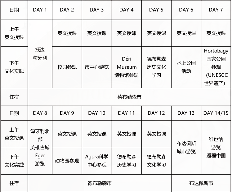 为帮助同学们走出国门,拓展国际视野,提高国际认知能力,营造优良英语学习环境,促进中欧教育与文化交流,增强同学们“胸怀祖国、放眼世界”的切身体验,学校决定与匈牙利 德布勒森大学合作举办优秀大学生2023年夏季赴欧洲(匈牙利、奥地利)游学营。活动具体安排如下。