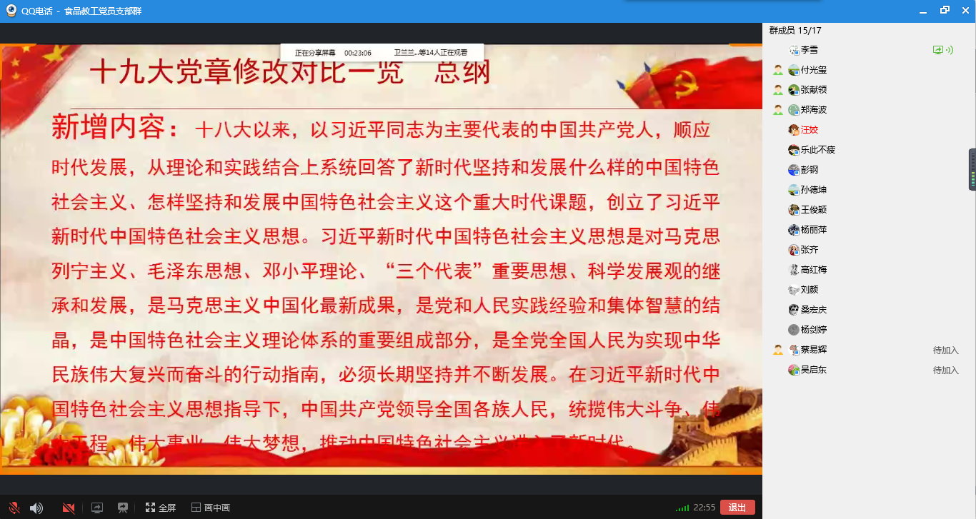 一场不期而遇的新冠肺炎疫情打乱了人们的生活和工作节奏,也改变了我们的工作方式,在疫情尚未完全解除的形势下,高校党建工作怎么抓?党组织三会一课怎么开展?食品工程学院教工党支部充分利用信息网络平台的优势,对特殊时期党员线上学习进行了有益的探索。3月25日下午,食品工程学院食品教工支部通过QQ群视频的方式开展了本学期的第一场线上集中学习,该支部的15名党员参加了线上学习,会议由支部书记郑海波主持。
