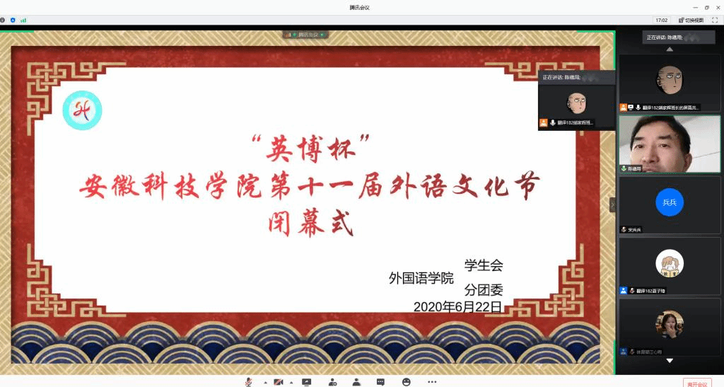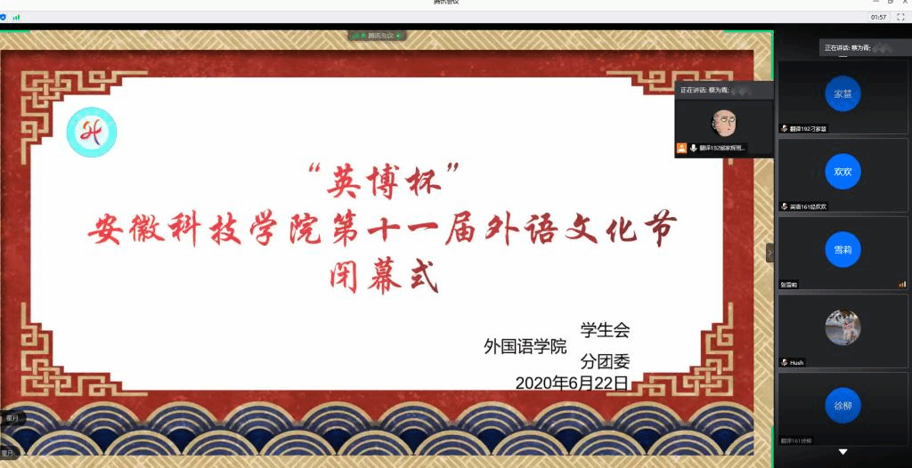 6月22日晚上,外国语学院在腾讯会议隆重举行“英博杯”拼搏平台_拼搏网页版第十一届外语文化节闭幕式。校党委委员、宣传(统战)部长卫胜,校团委书记黄立义,外国语学院院长陈德用、党总支书记蔡为青、副院长刘萍及部分老师出席“线上”闭幕式,学院大部分学生参加闭幕式,闭幕式由蔡为青主持。