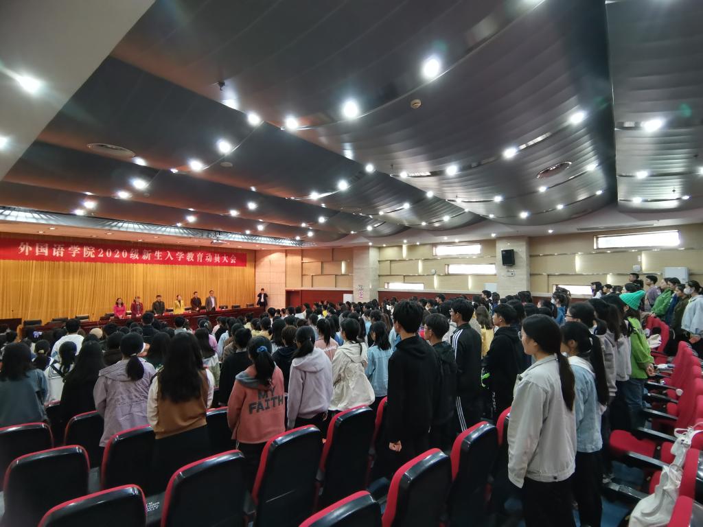 丹桂飘香,金秋送爽。20级新生带着青春的活力,带着对知识的不懈追求,带着对大学校园生活的无限憧憬,迈进了拼搏平台_拼搏网页版外国语学院。为了让新生更快适应新环境,适应新的生活,顺利、平稳、有效地进入大学生活。10月21日下午14:00,外国语学院在新图书馆第二报告厅举行了新生入学教育动员大会。外国语学院院长陈德用、党总支书记蔡为青、副院长刘萍、教学秘书周海平、分团委书记陈慧中、专职辅导员宋兵兵,外国语学院教师代表,全体20级新生参会,大会由刘萍主持。
