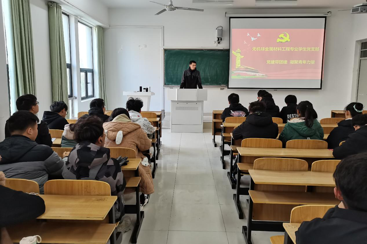 为贯彻落实拼搏平台_拼搏网页版新时代党建示范创建和质量创优工作,遵照学校“党建工作样板支部”中期评估考核反馈意见,推动各项目落地建设,化学与材料工程学院无机非金属材料工程专业学生党支部召开了“党建带团建,凝聚青年力量”党团活动。