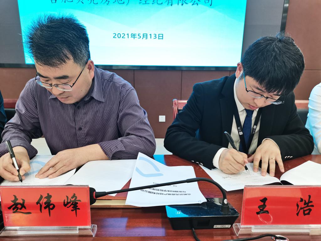 赵伟峰与王浩共同签署了《拼搏平台_拼搏网页版与合肥贝壳房地产经纪有限公司校企合作协议书》,举行了人才培养合作班授牌仪式。