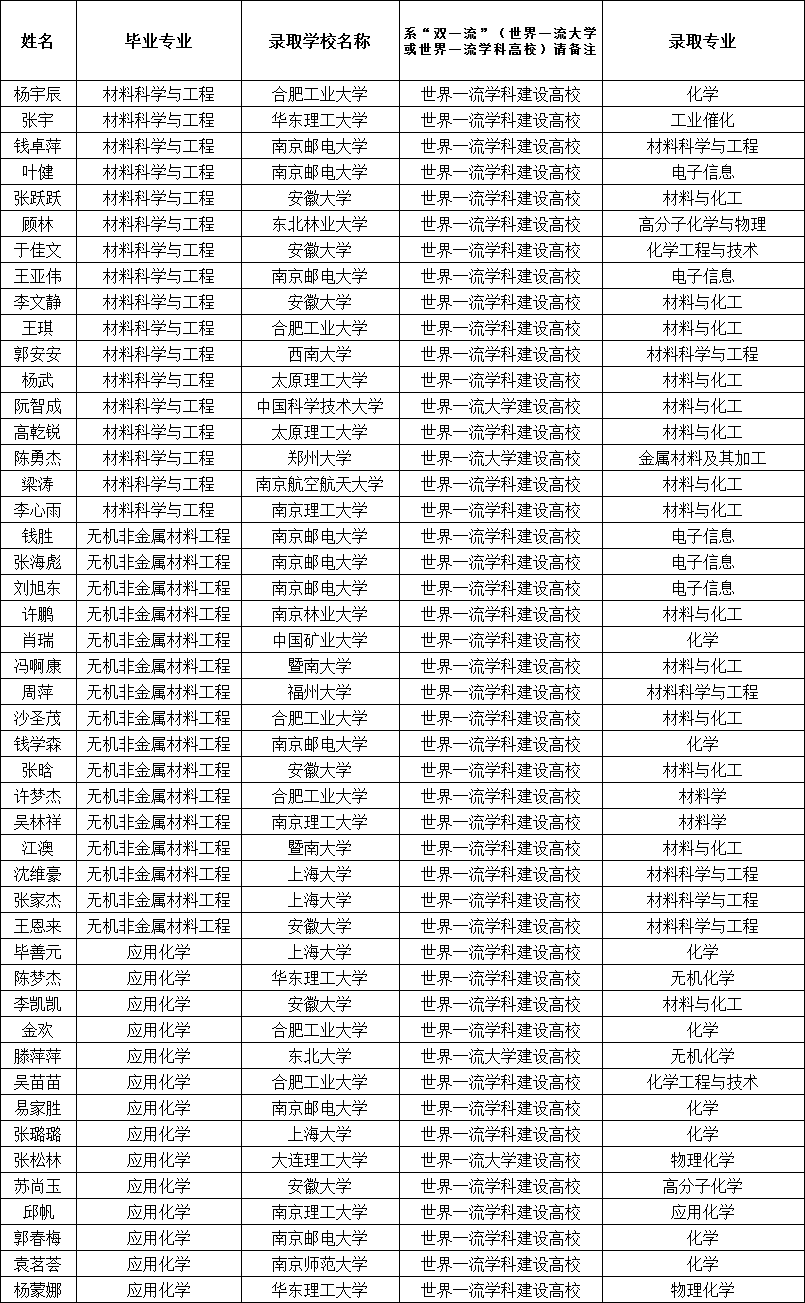 三是集体考研氛围浓厚,互帮互学互促蔚然成风学院积极营造优良的学风,同学间互帮互学互促蔚然成风,2021届毕业生中材料科学与工程专业考取研究生率达到29.6%、应用化学专业考取研究生率达到34.2%、无机非金属材料科学与工程专业考取研究生率达到35.1%。同寝室录取人数不断增多,2021年学院出现同寝室全部考取研究生的寝室为3个(4人间,下同),同寝室超过一半考取研究生的寝室22个。