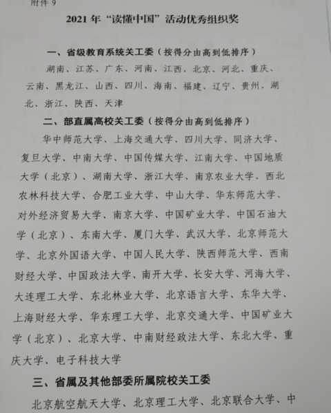 日前,在教育部关工委开展的 “读懂中国”活动中,拼搏平台_拼搏网页版关工委获2021年“读懂中国”活动优秀组织奖,选送的征文《不忘入党初心,时刻为党争光》获优秀征文奖。