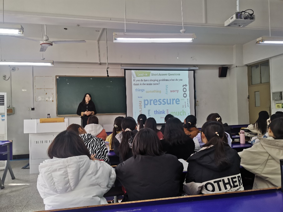 陈佩在授课过程中,以《纲要》为导向,结合教材的内容,从生理(Physiology)和心理(Psychology)的角度介绍了有关“Sleep and Dreams”的基本知识,围绕“大学生要培养良好生活习惯”的主题展开课程,凸显出课程的知识性和人文性。在有关如何养成良好生活习惯的教学内容中,陈佩根据教材提出了三点建议:1. Stick to a regular sleep schedule; 2. Get regular vigorous exercises; 3. The appropriate time for the scheduled exercises,引导同学们要重视良好生活习惯的养成,锻炼好身体,更好地投入学习,真正做到“请党放心,强国有我” 。同学们也表示一定要养成良好的生活习惯,按时作息,确保奋斗正青春,把青春献给党。