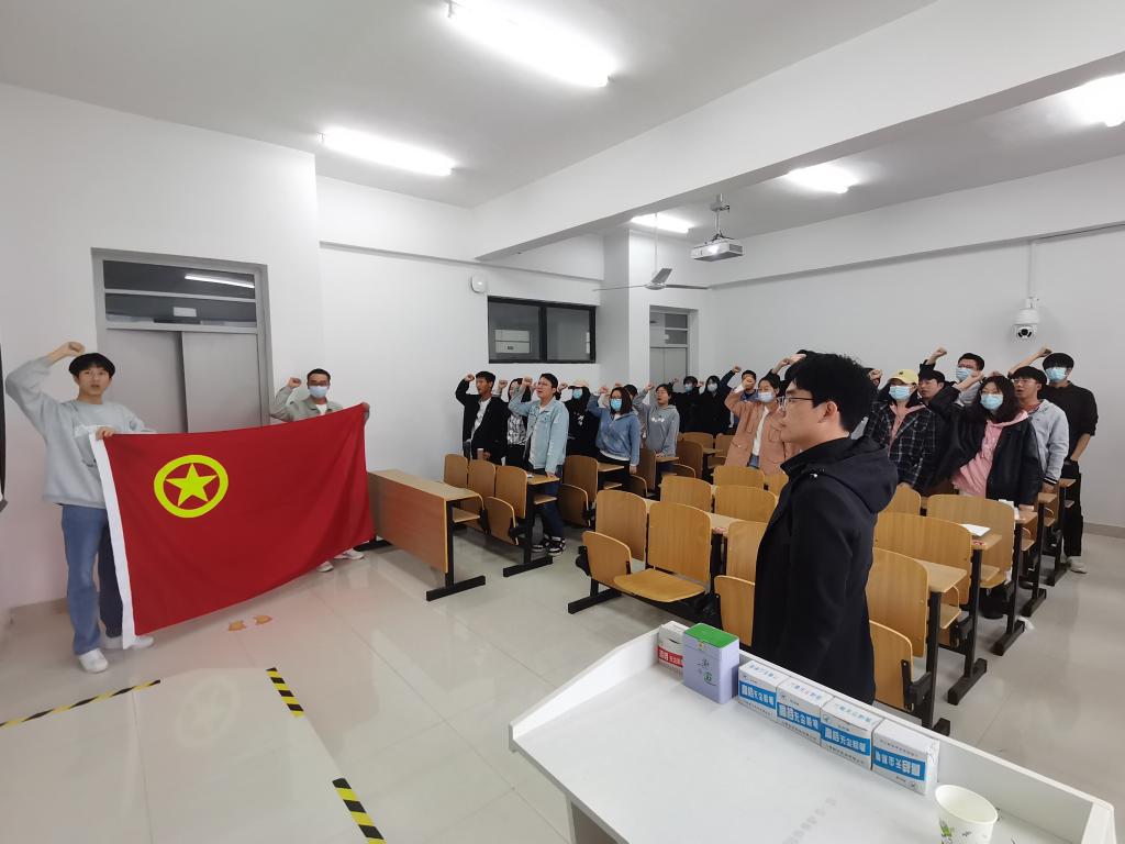 站在鲜红庄严的中国共产主义青年团团旗下,全体共青团员一同重温了入团誓词。