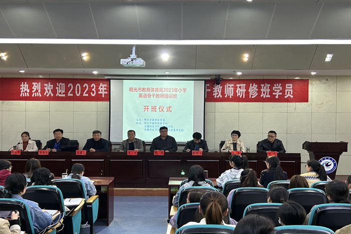 4月8日,由我校外国语学院承办的“明光市教育体育局2023年小学英语骨干教师研修班”开班仪式在我校新图书馆一楼报告厅举行。明光市教育体育局师训办主任李刚、明光市教师进修学校校长陶彦、明光市教师进修学校党支部副书记汪德喜、明光市教育体育局英语教研室教研员徐华乔,外国语学院院长刘萍、副院长洪民等出席开班仪式。开班仪式由外国语学院党委书记蔡为青主持。来自明光市33所小学的62名小学英语骨干教师全部出席开班仪式,并将参加为期4天的集中研修学习。