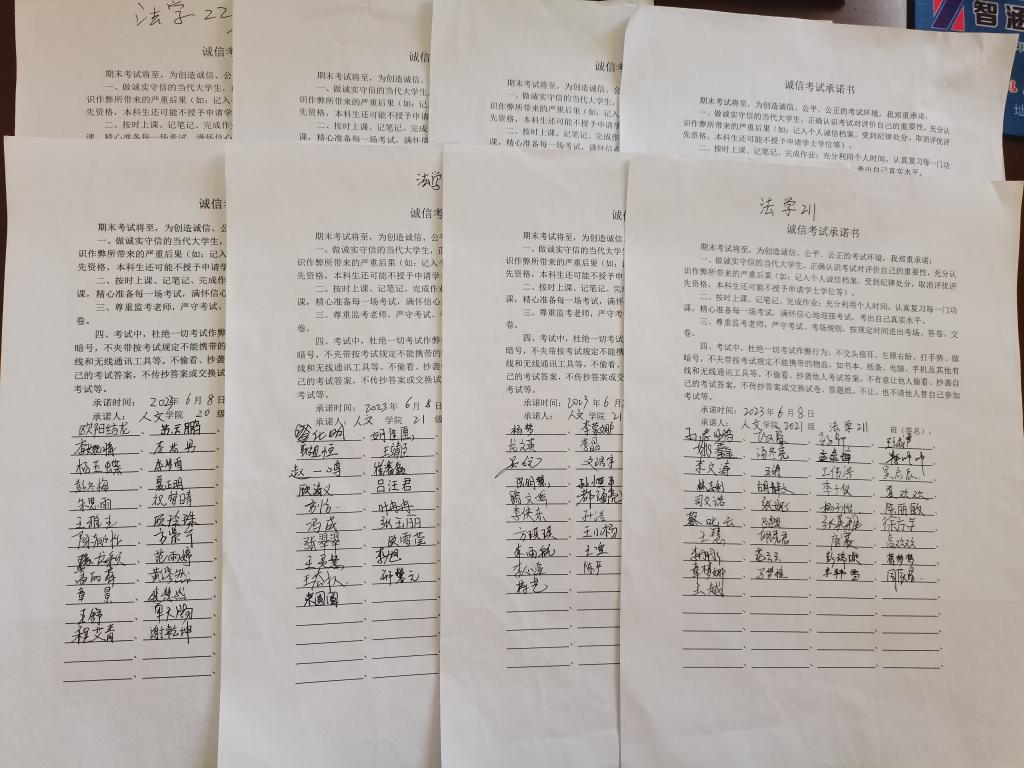 人文学院组织各班级学生签署诚信考试承诺书,引导学生牢固树立诚信为本、操守为重、守信光荣、失信可耻的诚信意识和道德观念,培养学生诚信待人、诚信立身、诚信学习、诚信考试的良好习惯,教育学生珍爱诚信、拒绝舞弊、文明应考,自觉遵守考场纪律,自觉抵制违法违纪行为,营造诚实守信、公平公正的考试环境,倡导学生将时间和精力放在复习迎考上。