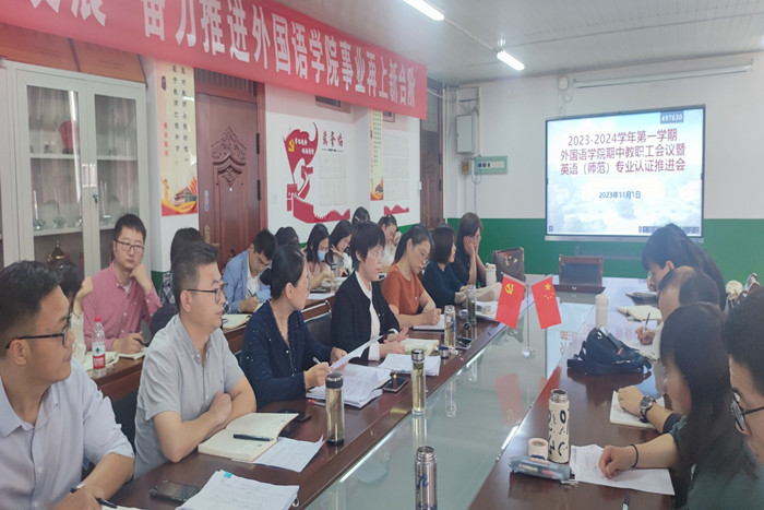 11月1日下午,外国语学院在学院会议室召开2023-2024学年第一学期期中教职工大会暨英语(师范)专业认证推进会,学院党政领导和全体教职工参加会议。会议由外国语学院院长刘萍主持。