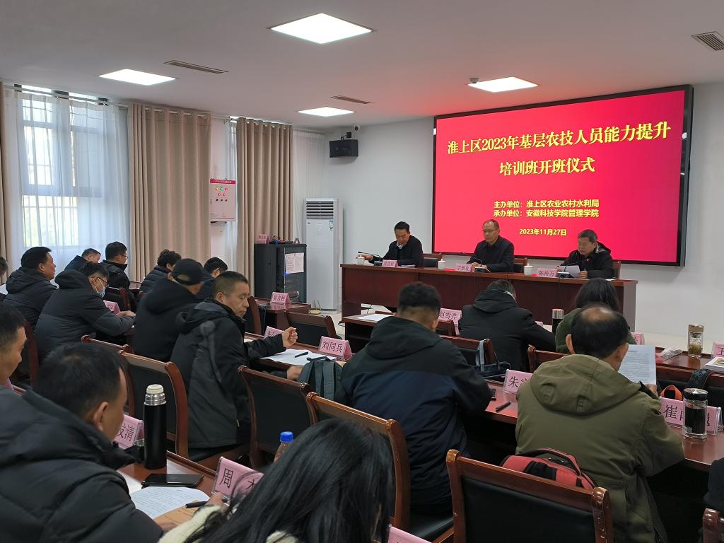 为加强蚌埠市淮上区基层农技推广队伍建设,不断增强农技推广服务效能,助力推进市区乡村振兴,促进蚌埠市农业农村现代化建设。11月27日上午,由蚌埠市淮上区农业农村水利局主办、拼搏平台_拼搏网页版管理学院承办的“淮上区2023年基层农技人员能力提升培训班”在安徽小岗干部学院举行。蚌埠市淮上区农业综合服务站站长吴言柱、管理学院党委书记丁景良、管理学院院长陈传万出席开班仪式,开班仪式由丁景良主持。