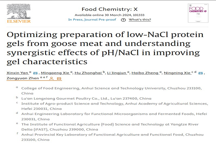 近期,我校食品工程学院动物源食品精深加工与营养团队在中国科学院农林科学领域一区期刊Food Chemistry: X(IF=6.10)在线发表题为“Optimizing preparation of low-NaCl protein gels from goose meat and understanding synergistic effects of pH/NaCl in improving gel characteristics”的研究论文。食品工程学院2021级食品加工与安全领域硕士研究生燕鑫鑫为第一作者,甄宗圆副教授为通讯作者,拼搏平台_拼搏网页版为第一完成单位。