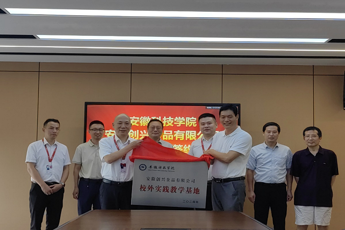之后,调研工作组一行前往李府集团安徽创兴食品有限公司,受到了集团负责人辛国芳、公司负责人崔君秋、唐钢等人的热烈欢迎。在李府集团安徽创兴食品有限公司,付光玺向企业接待人员介绍了调研目的,杜传来介绍了食品工程学院专业设置、教学科研情况,翟立公和郑海波分别就产学研合作、学生实习和实践教学基地共建、企业人才需求、人才培养方案修订等与企业方面进行了深入交流,得到了企业方面积极回应,交流坦诚务实,并对未来合作充满期盼。杜传来和辛国芳代表双方签署了校外实践教学基地协议,付光玺与辛国芳共同为校外实践教学基地揭牌。