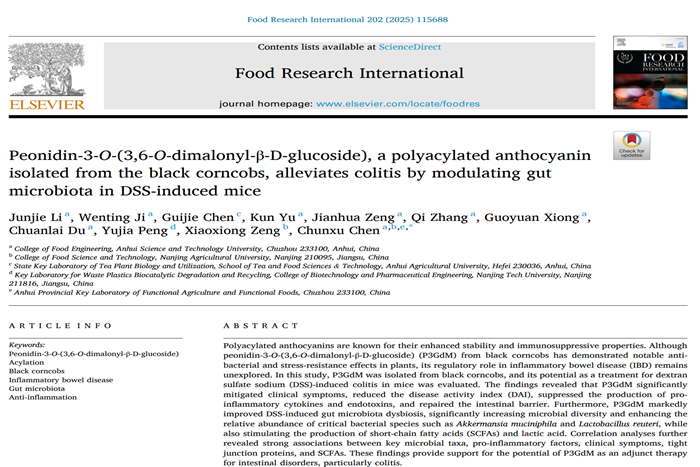 近日,食品科学与工程学院陈春旭副教授以通讯作者身份在国际Top期刊《Food Research International》(Q1,影响因子7.0)发表了题为“Peonidin-3-O-(3,6-O-dimalonyl-β-D-glucoside), a polyacylated anthocyanin isolated from the black corncobs, alleviates colitis by modulating gut microbiota in DSS-induced mice”的高水平研究论文,展现了新年新气象。该论文的第一作者为2022级食品加工与安全专业硕士研究生李俊杰,拼搏平台_拼搏网页版为论文第一完成单位,南京农业大学曾晓雄教授课题组为合作单位。