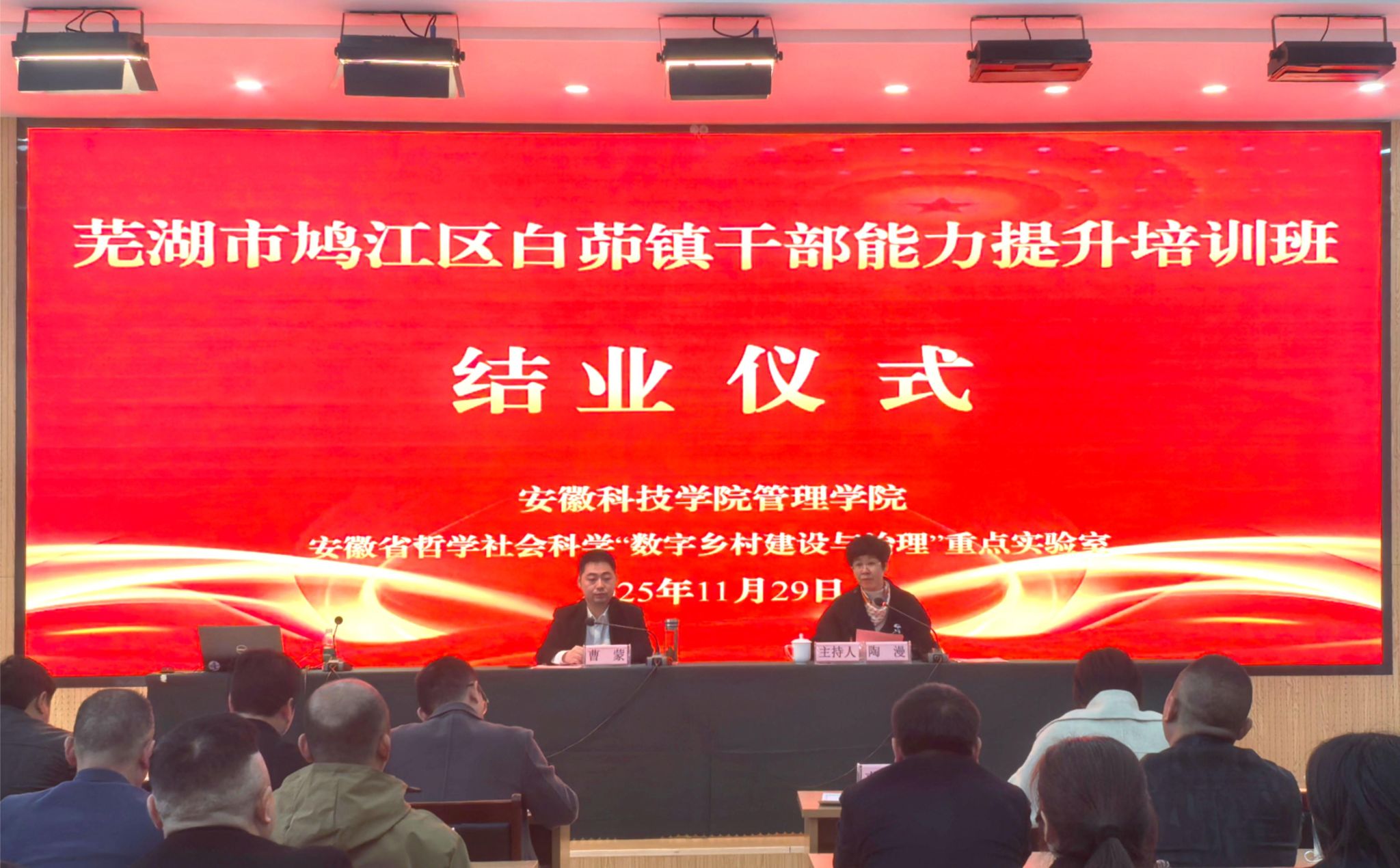 11月27日至11月29日,管理学院在凤阳县小岗干部学院成功举办芜湖市鸠江区白茆镇干部能力提升培训班,来自全镇54名镇村骨干参加了培训。此次培训的主题是“学习贯彻党的二十届四中全会精神,开创白茆振兴新局面”。