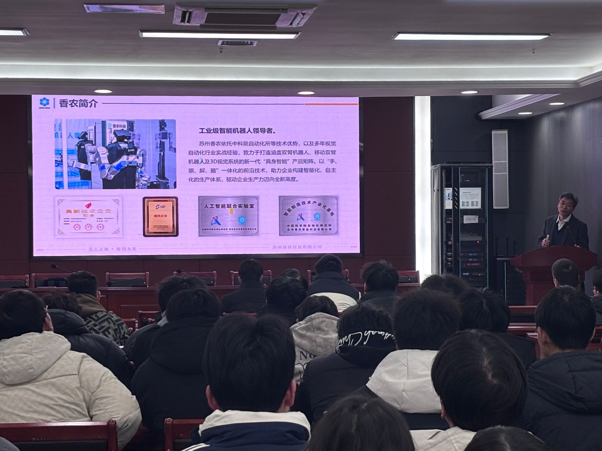 施晓明以同学们对机器人行业的了解情况为开端,带来了行业前沿的技术分享。作为自动化领域领军企业,香农科技已打造10家智慧工厂,当前聚焦具身智能机器人在工业领域的推广落地。施晓明介绍,公司自研的“手、眼、脚、脑”一体化技术,让机器人拥有精准感知、灵活操作与智能决策能力,已广泛应用于汽车制造、能源石化等行业,既提升生产效率,又保障工人安全。其研发团队核心成员平均拥有10年以上行业经验,技术实力雄厚。此次进校宣讲,正是希望吸纳更多电气电子及计算机类优秀理工科人才,共同推动行业发展。互动交流中,施晓明与团队成员耐心解答同学们关于岗位发展、薪资福利等问题,并表示香农科技将为员工提供完善的培训体系、广阔的晋升空间和具有较强竞争力的薪资待遇,让每一位员工都能与企业共同成长、共同进步。