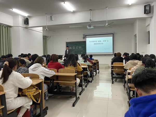 为了进一步增强大学生的诚信文明意识,提高大学生的思想道德素质,培育校园诚信文化氛围,培养学生树立诚信文明的正确做人理念。建筑学院于11月3日在致知楼C306举办了“诚信.文明”主题教育推进会。本次推进会由建筑学院辅导员蒋臣主讲,辅导员沈德艳、建筑学院20级全体班干部和寝室长参加了会议。