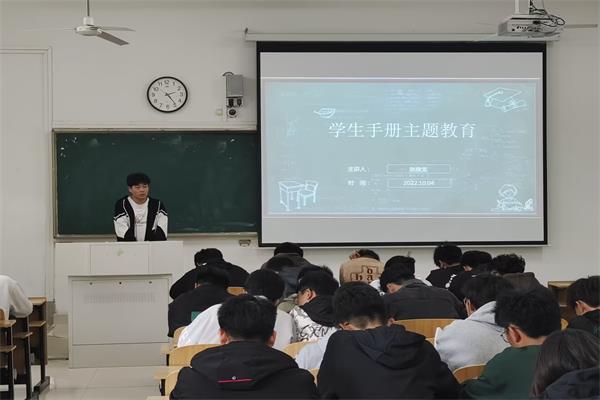 为加强新生校规校纪教育,提高新生自律意识和安全防范能力,10月4日至7日建筑学院分专业组织2022级新生集中学习《拼搏平台_拼搏网页版学生手册》,新生辅导员助理赵俊龙担任主讲。