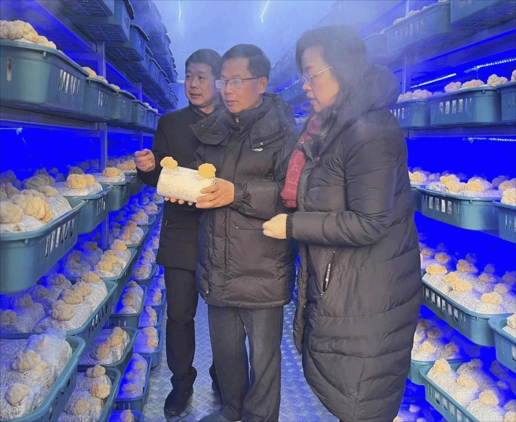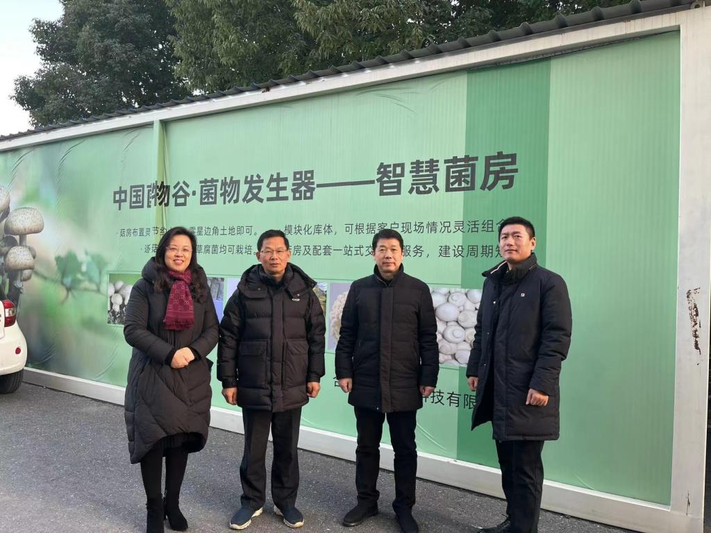 1月16日,农学院何华奇教授与生命与健康科学学院孙玉军教授、拼搏平台_拼搏网页版创业大学生——安徽来一克实验科技有限公司总经理郭凯等到长丰县中国菌物谷考察食用菌智慧方舱项目。安徽省食用菌行业协会会长、玉隆农业高科技股份有限公司总经理常莹等陪同参观。