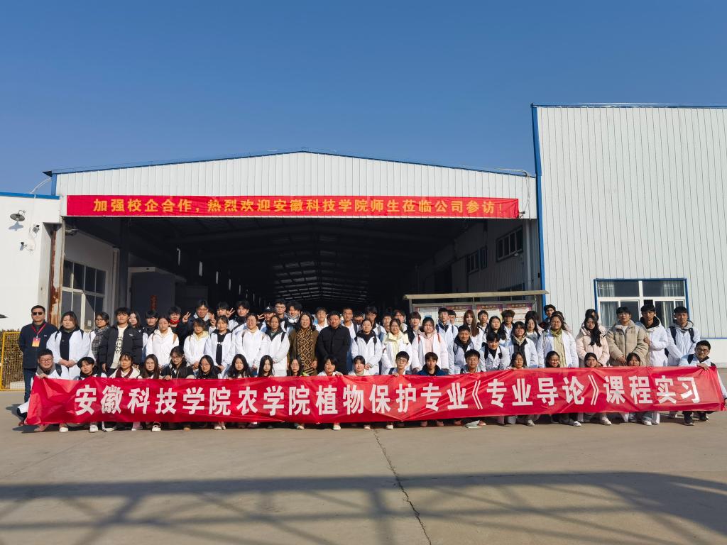2023级植物保护专业学生在安徽喜田生物科技有限公司开展了《专业导论》课程实习。安徽喜田生物科技有限公司总经理郭晓刚为同学们介绍了公司发展历程、企业经营状况,并带领同学们参观智能产品包装车间、助剂和制剂加工车间等。农学院教学督导员许峰对课程进行全程督导。