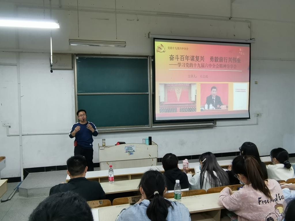 石志成以习近平总书记在庆祝中国共产主义青年团成立100周年大会上的重要讲话引出党课主题。宣讲会上,石志成强调,党的十九届六中全会精神主要集中在全会审议通过的《中共中央关于党的百年奋斗重大成就和历史经验的决议》(简称《决议》)。《决议》坚持辩证唯物主义和历史唯物主义的方法论,分四个阶段总结了党的百年奋斗的重大成就,从五个方面概括了党的百年奋斗的历史意义,从十个方面总结了党的百年奋斗的历史经验,是一篇光辉的马克思主义纲领性文献。石志成勉励同学们大力弘扬伟大建党精神,勿忘昨天的苦难辉煌,无愧今天的使命担当,不负明天的伟大梦想,以史为鉴、开创未来、埋头苦干、勇毅前行!