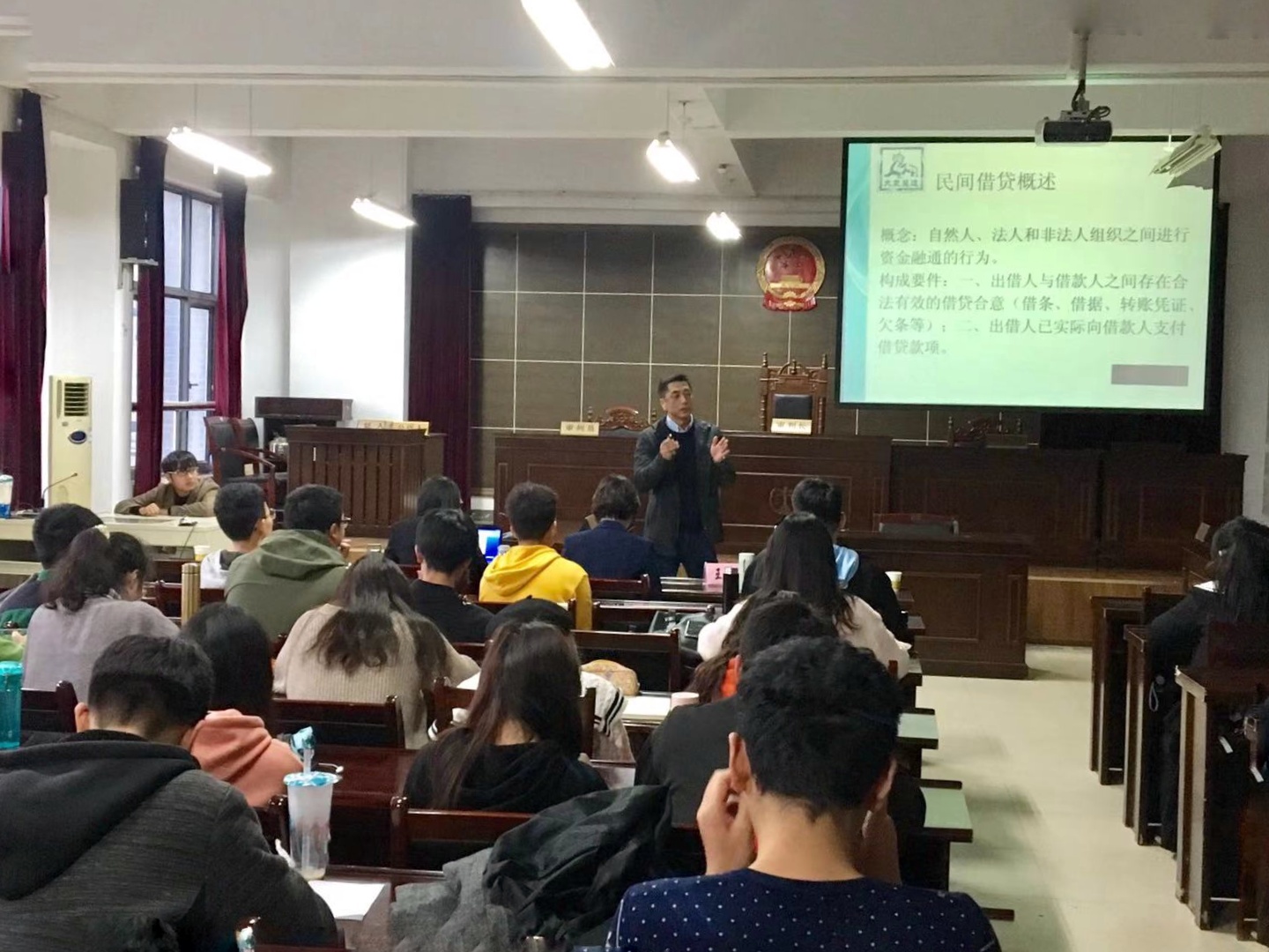 11月17日下午,“知秋杯”第一届拼搏平台_拼搏网页版法治论坛系列活动——“以案说法”在模拟法庭举办。安徽大友昱达律师事务所执行主任杨根宝作“民间借贷纠纷实例分析”主题报告。安徽大友昱达律师事务所律师王苏敏、安娟、黄娜、潘亮等受邀出席。活动由人文学院院长助理骆绪刚主持。