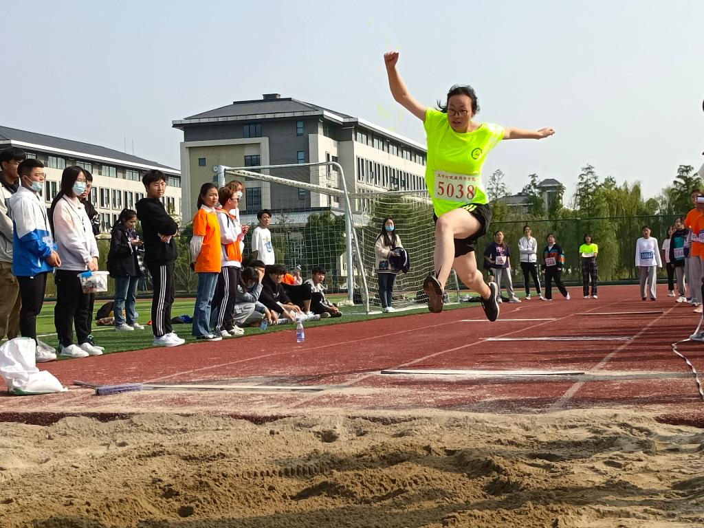 奋力向前的三级跳远迸发出选手的热爱与执着。每一次跳跃,都是信心的展现,每一次落地,都是对青春最好的礼赞。在如矫健的飞燕轻捷掠过沙坑之后,生物工程213班的叶楚琪成功夺得女子三级跳远第一名。