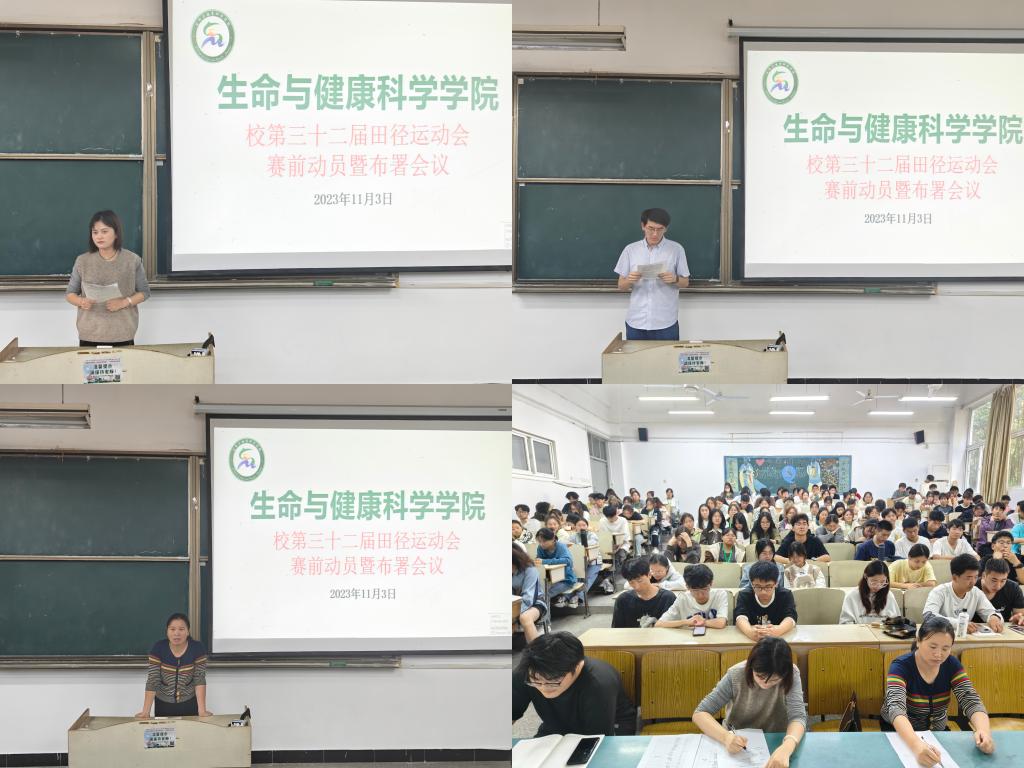 为保障校第三十二届运动会顺利举办,11月3日中午,生命与健康科学学院在求知楼A101教室召开校第三十二届田径运动会赛前动员暨部署会议。院党委副书记、纪委书记彭丽萍,团委副书记姜毅,专职辅导员沈靓出席本次会议,各班级体育委员(文体委员)、学院参赛运动员以及学生会全体成员参加。本次会议由沈靓主持。