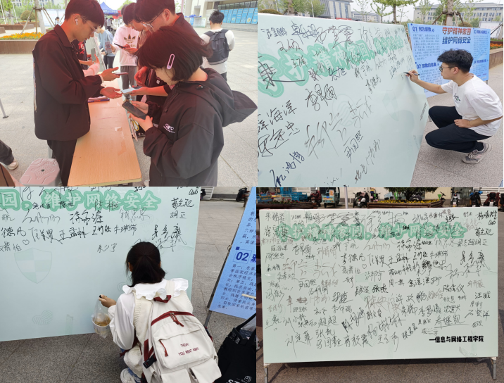 本次网络安全知识宣传展旨在向同学们宣传介绍有关网络安全、防范电信诈骗、金融贷款、反邪教等方面的警示教育知识。在活动过程中,讲解员现场介绍网络安全相关法规政策、安全防护措施,促进同学们网络安全意识提高及安全风险辨别能力提升。在活动后,同学们纷纷在签名板上签名字并承诺:从自身做起,自觉维护国家网络安全,做一名“文明上网”的倡导者和先行者,并向更多地同学宣传普及网络安全知识,共同营造风清气正的网络空间。