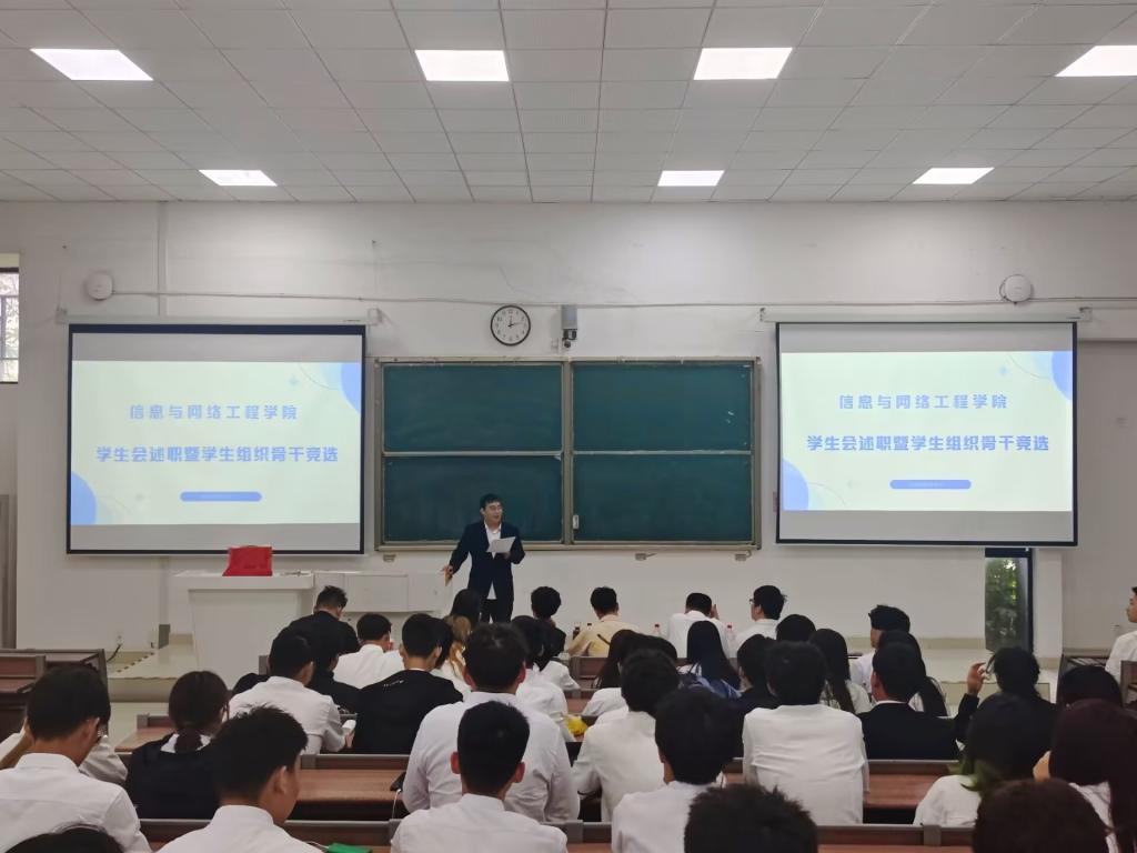 为加强学生干部队伍建设,提高学生干部的责任意识、服务意识、大局意识,6月4日下午,信息与网络工程学院在致知楼C111召开学生会述职暨学生组织骨干竞聘大会。学院学生会指导老师崔北坤及学生会全体成员参加本次会议,龙湖校区其他学院学生会负责人担任评委,会议由学生会主席团成员开祥颖主持。