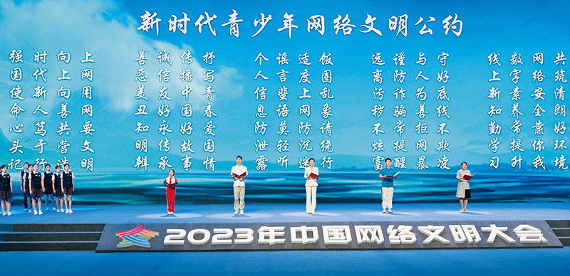 党的十八大以来,习近平总书记围绕加强网络文明建设、共建网上美好精神家园发表一系列重要论述,深刻揭示了网络文明建设的规律。图为2023年7月18日,在福建省厦门市举行的2023年中国网络文明大会主论坛发布《新时代青少年网络文明公约》。 新华社记者 林善传/摄