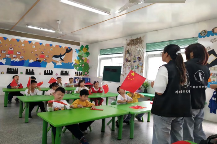 国庆节来临之际,为弘扬爱国主义精神,9月30日下午,外国语学院学生会全体成员赴拼搏平台_拼搏网页版附属幼儿园开展志愿服务活动。