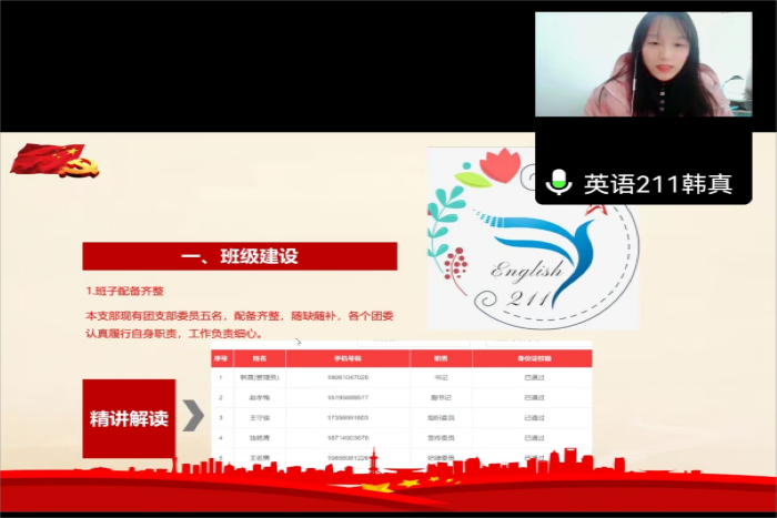 为进一步促进团支部规范化、标准化建设,不断增强团组织活力,外国语学院于12月18日下午在腾讯会议上举办2022年团支部书记述职暨“对标定级”PPT汇报会,学院团委全体委员及各团支部书记参会,本次汇报会由学院团委宣传委员吕新月同学主持。