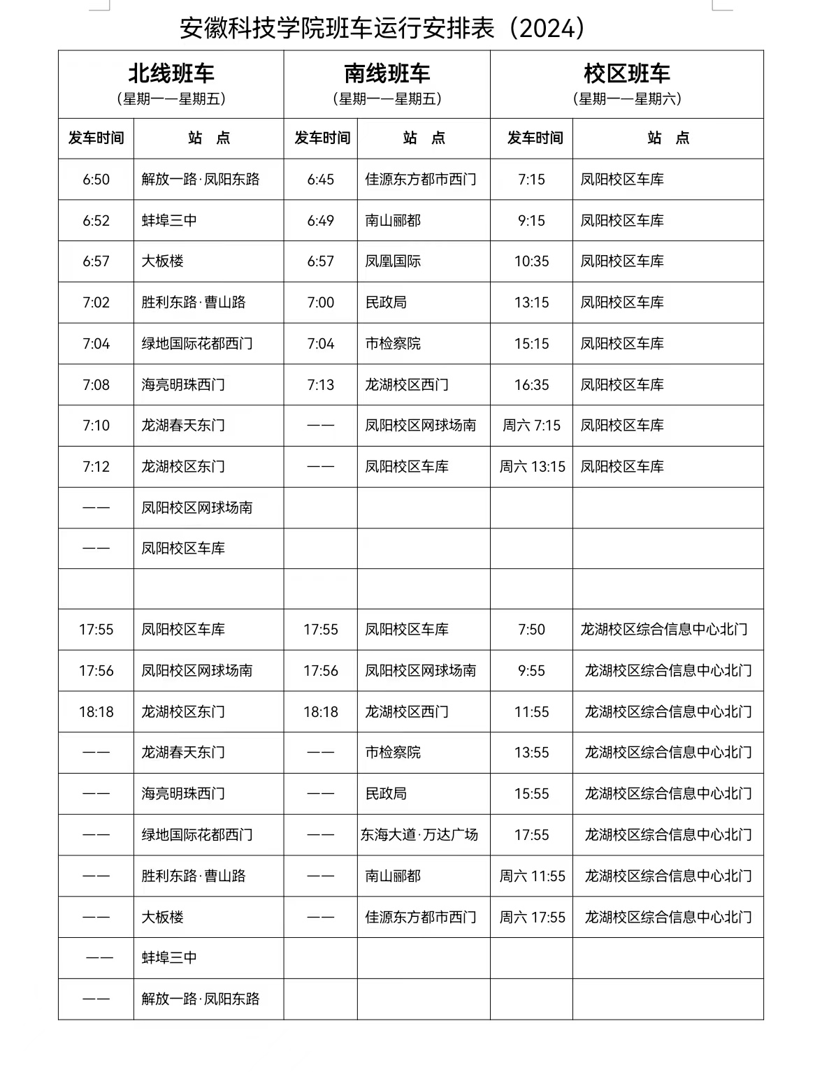 2.校区班车运行时间为:凤阳校区车库7:30、13:30;龙湖校区综合信息中心北门12:10、17:45。