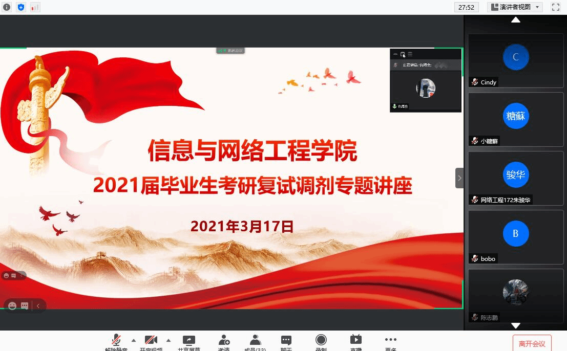 为贯彻落实习近平总书记在党史学习教育动员大会上的重要讲话精神,切实为学生“办实事”,3月17日,信息与网络工程学院借助腾讯会议召开主要由教师党员仇海全、李锐、李军成、崔北坤和网络工程系主任王传安参加的考研复试指导专题讲座。学院党委副书记韦乃学以及达线50名学生参加,讲座由专职辅导员陈凯主持。