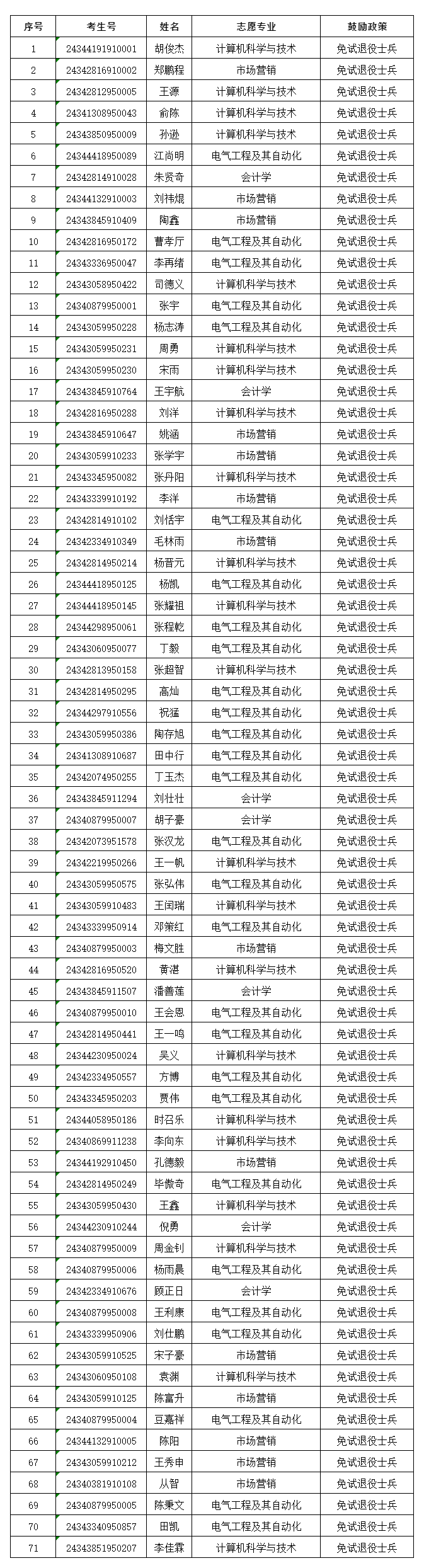 根据《拼搏平台_拼搏网页版2024年普通高校专升本招生章程》关于申请免文化课考试退役士兵专项计划,相关要求,经审核,胡俊杰等71名考生符合申请免试条件,现予以公布。如有异议或遗漏,请于4月9日12:00前,与拼搏平台_拼搏网页版招生办公室联系。联系电话:0550-6732041,0552-3197041。
