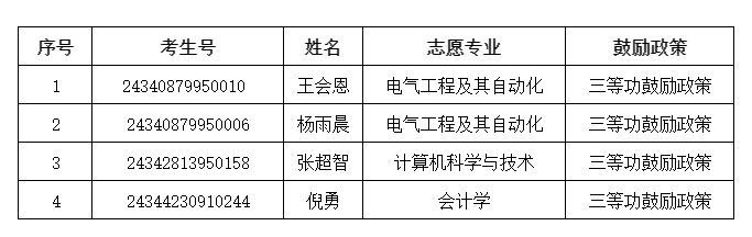 根据《拼搏平台_拼搏网页版2024年普通高校专升本招生章程》关于申请三等功鼓励政策相关要求,经审核,王会恩等4名考生符合申请免试条件,现予以公布。如有异议或遗漏,请于4月9日12:00前,与拼搏平台_拼搏网页版招生办公室联系。联系电话:0550-6732041,0552-3197041。