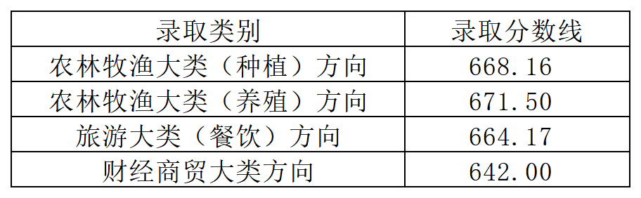 文化课达到最低控制线200分、专业技能成绩测试合格的考生,学校分别将农林牧渔大类(种植)方向考生、农林牧渔大类(养殖)方向考生、旅游大类(餐饮)方向考生、财经商贸大类方向考生的总分(文化素质测试成绩、专业理论考试成绩、技能测试成绩、政策加分之和)从高分到低分排序,依照专业志愿,依次录取。考生总分(含政策加分)相同时,按考试成绩总分(不含政策加分)排序;考生考试成绩总分(不含政策加分)仍相同时,则按单科成绩顺序从高到低排序,单科排序为:专业理论、技能测试、文化素质测试。农林牧渔类考生,如其分数未达到所填报专业的录取分数,按照考试成绩总分优先的原则(考试成绩总分相同时,按照前述单科成绩排序方式确定调剂顺序),调剂到所填报方向未录满专业。