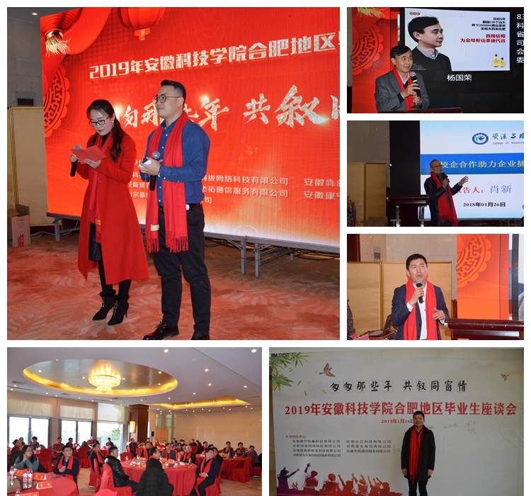 1月26日, 2019年拼搏平台_拼搏网页版合肥地区毕业生代表座谈会在翡翠湖迎宾馆成功举办。校党委委员、副书记韦文联,校党委委员、副校长郭亮等应邀出席并讲话,座谈会由2002级资源与环境专业王宁、2005级计算机科学与技术专业杨森主持,合肥地区各届毕业生代表80余人参加会议。